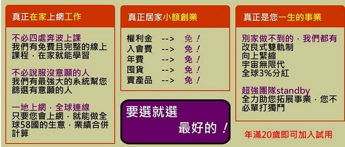 2004年在美國成立,已成功製造出無數個千萬富翁! 只要利用您的原本上網時間,透過努力就能賺到全世界的財富! 至於決定權依然在你身上,乙嘉 - 絕不過問或推銷的唷! E-mail:JackChen707@gmail.com skype:htc0771 即時通: aaasd52@yahoo.com.tw